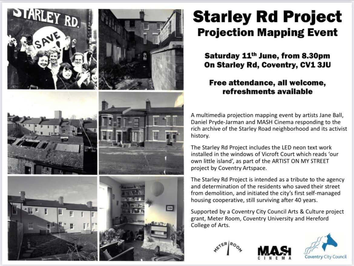 In June 2022, we worked with artists Daniel Pryde-Jarman & Jane Ball to projection map the cooperative housing archive of Starley Road in Coventry.